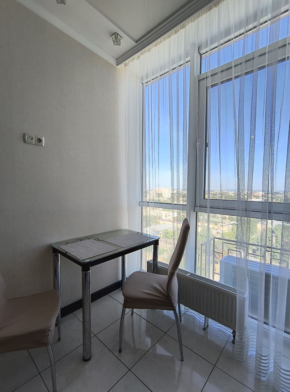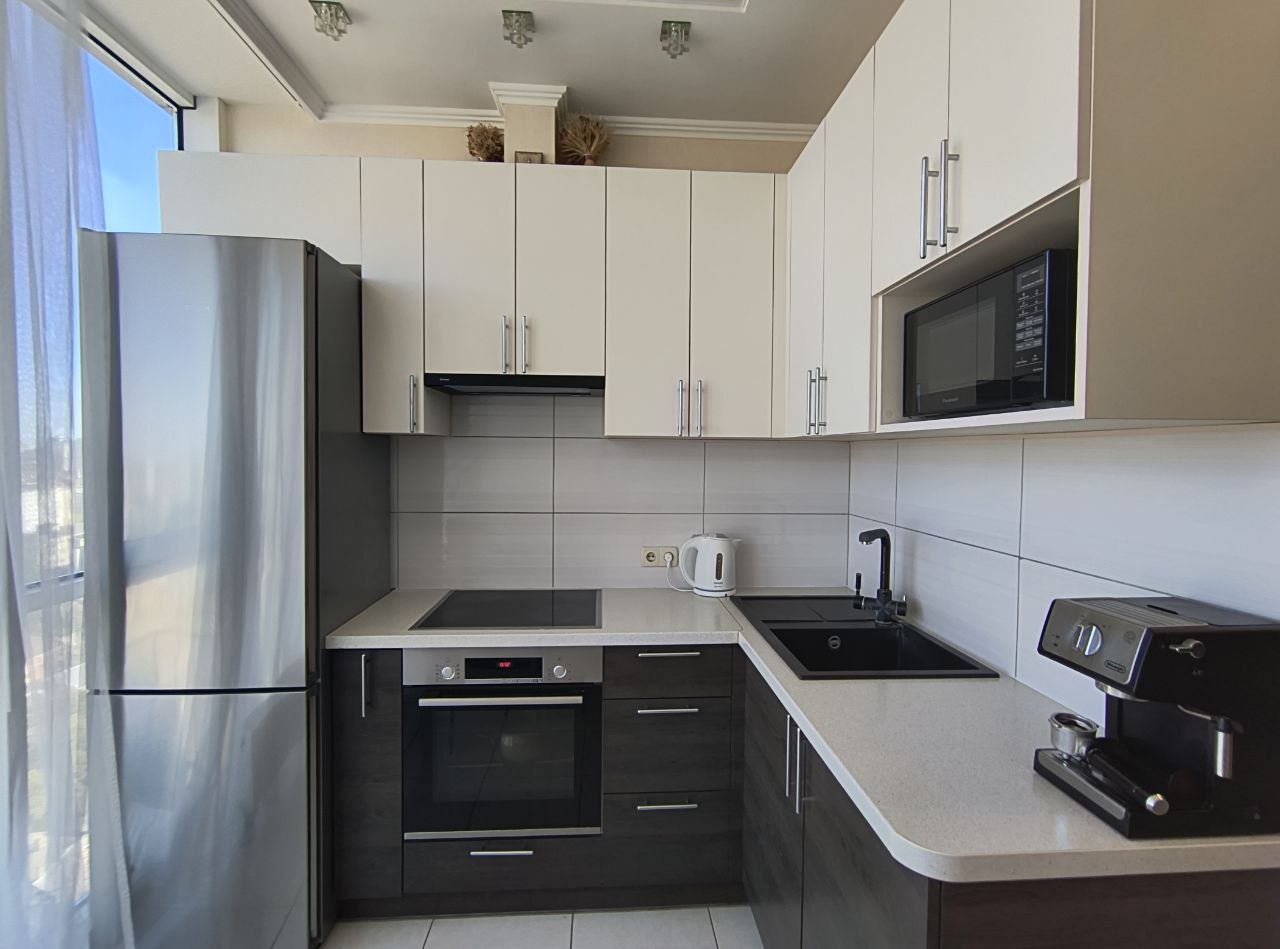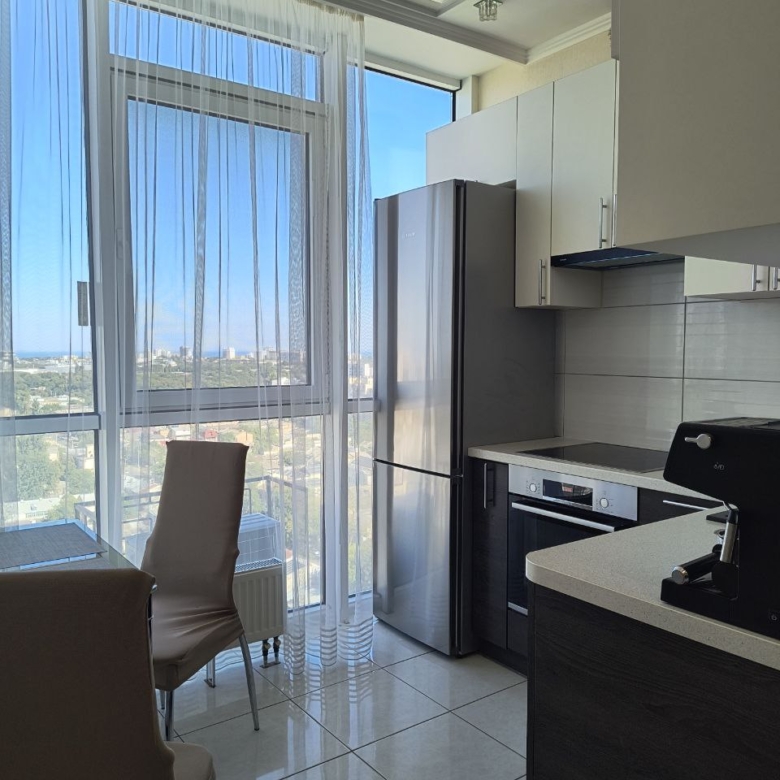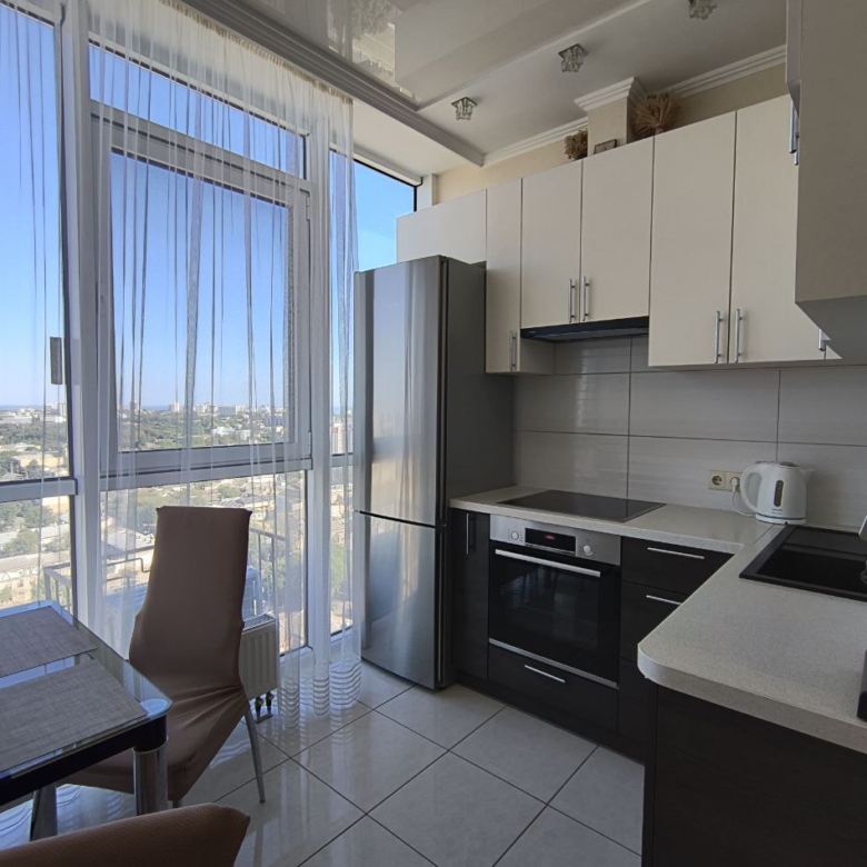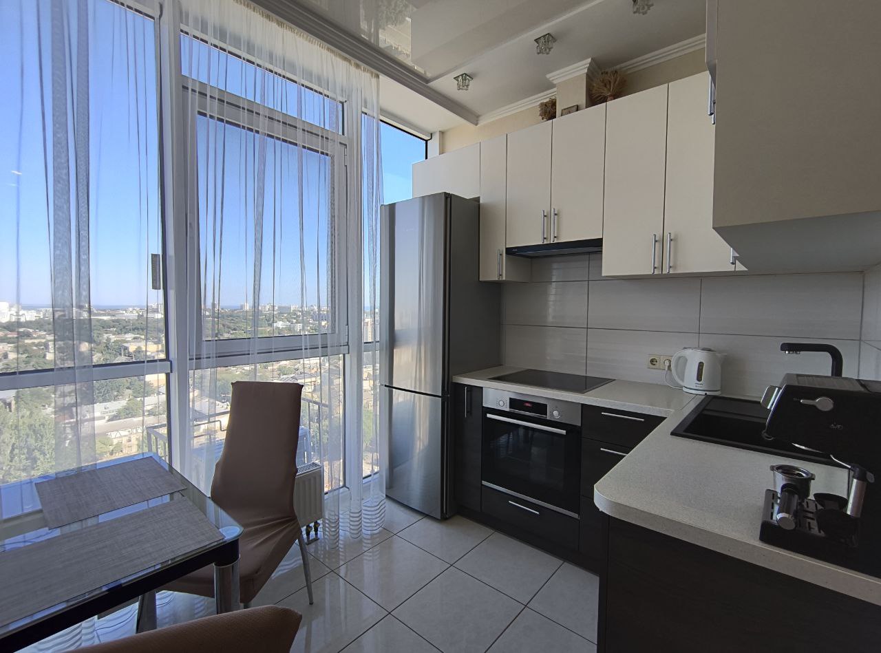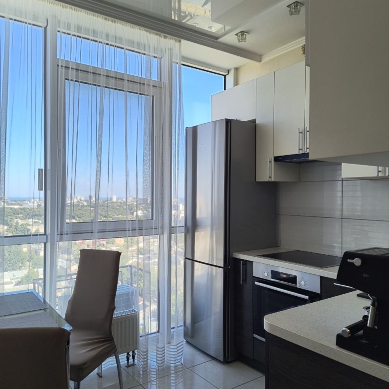 З вікон відкривається захоплюючий панорамний вид на місто та море, що додає відчуття свята у вашому житті. Ремонт виконаний з любов’ю та якісно, а також є стильні вбудовані меблі та сучасна побутова техніка.