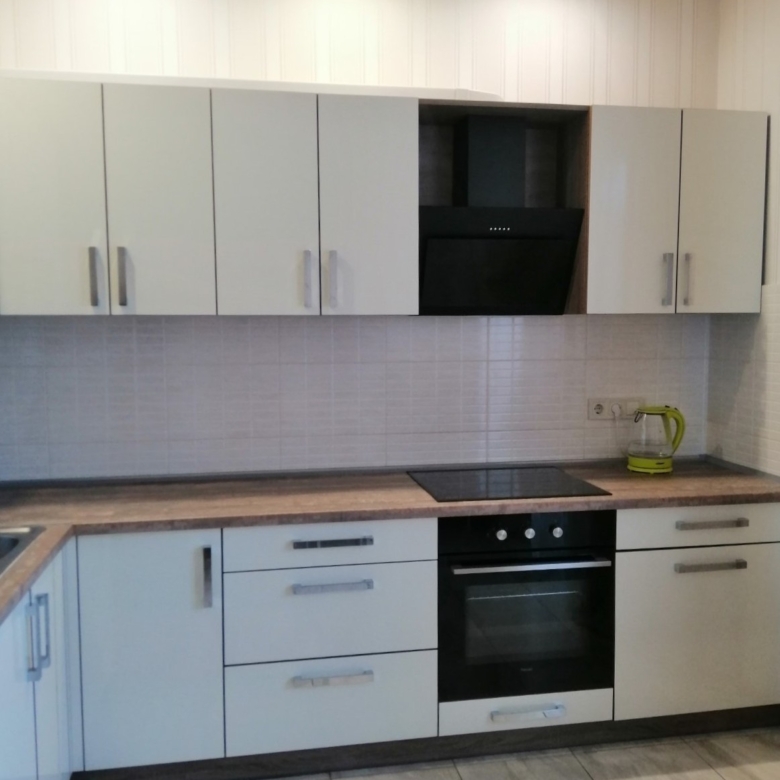 Вбудована кухня, виконана на замовлення, з легким дизайном та столом зі скляною стільницею – ідеальне місце для кулінарних шедеврів.