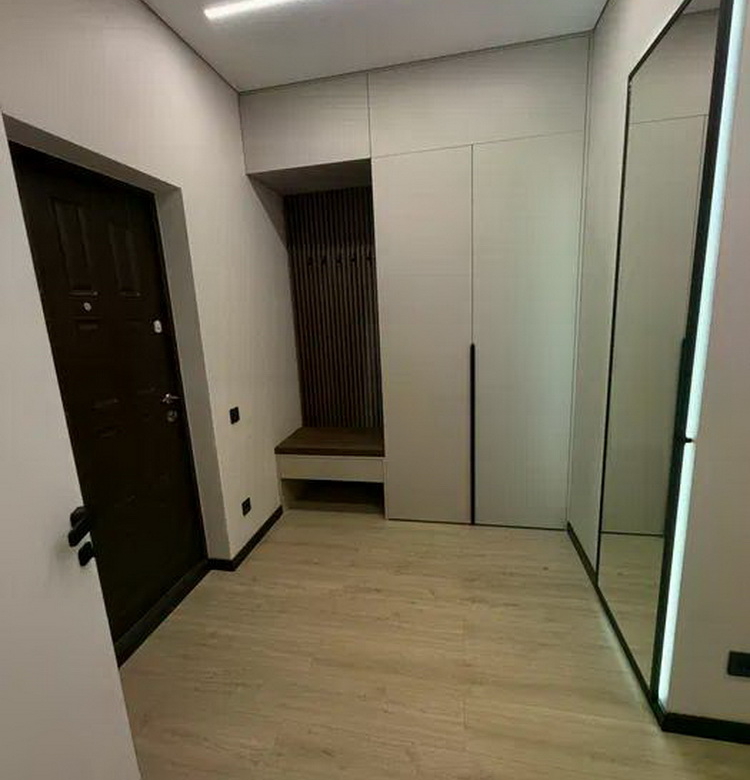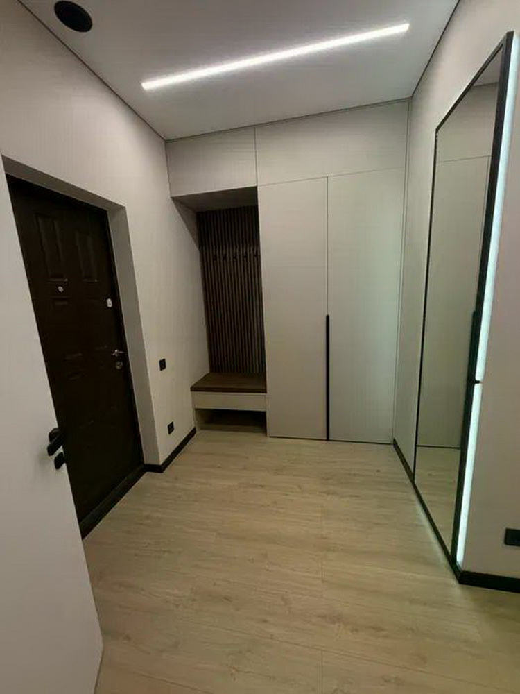 В кімнаті ви знайдете містку гардеробну, робочу зону та продуману прихожу. Ванні кімнати облаштувані вбудованими шафами, де є достатньо місця для зберігання речей. Квартира вражає своєю просторістю та легкістю, створюючи атмосферу справжнього дому.