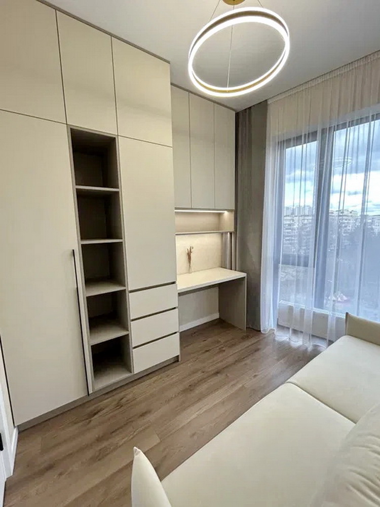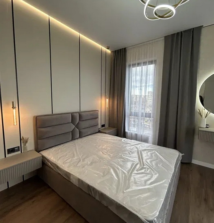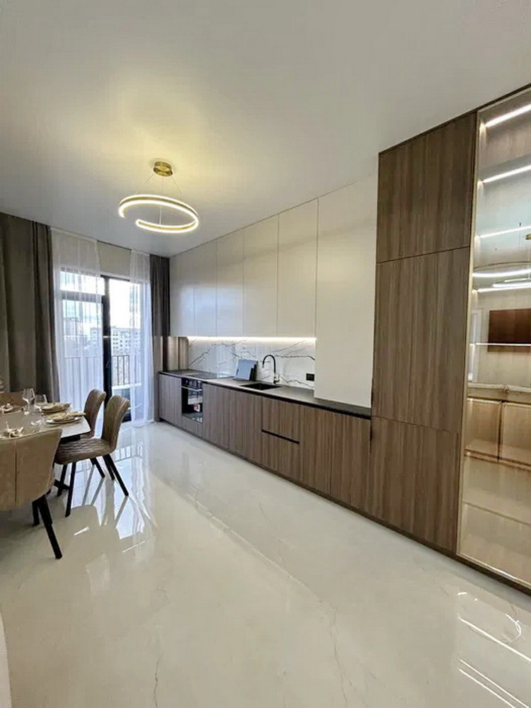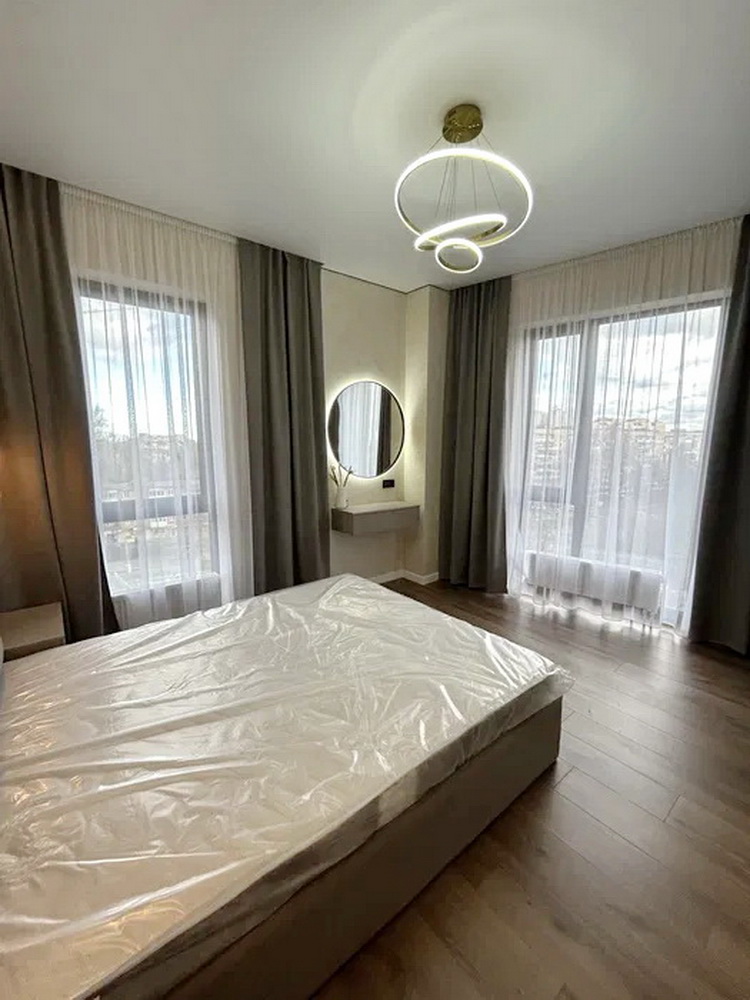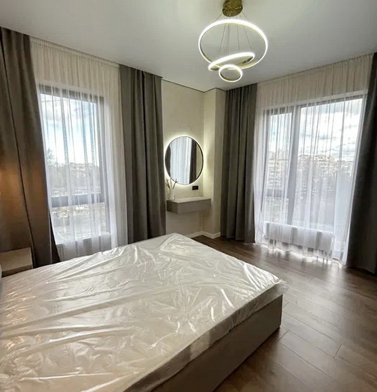 Простір розділений на дві просторові спальні, які подарують вам сонну гармонію та час для відпочинку. Величезна гардеробна кімната забезпечить порядок та зручність зберігання ваших речей. Просторий санвузол спроектований так, щоб стати вашим особистим невеличким оазисом. А кухня-студія з яскравим дизайном та затишною зоною відпочинку стане ідеальним місцем для вечірок із друзями чи романтичних вечорів.