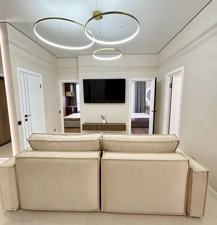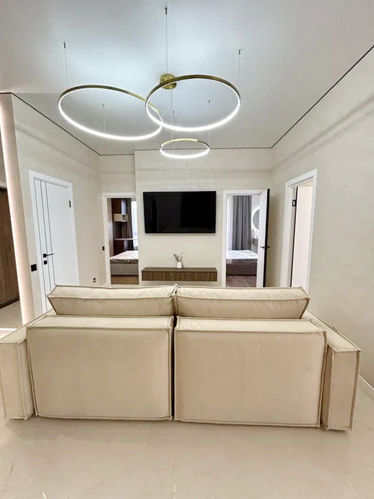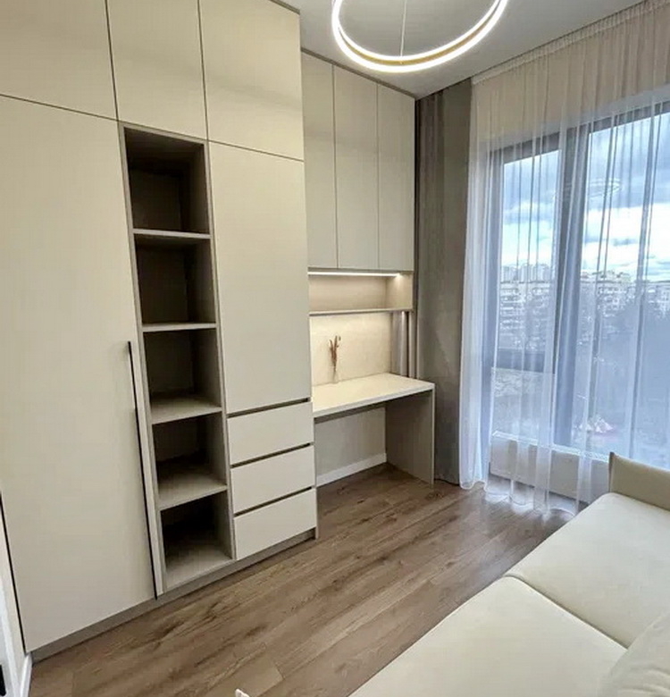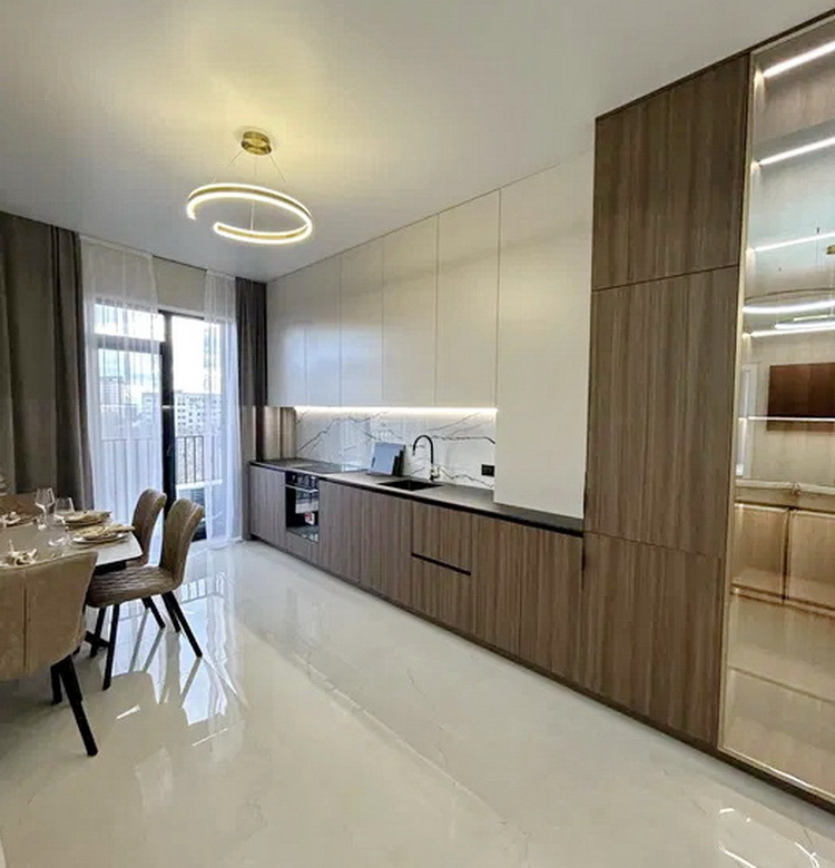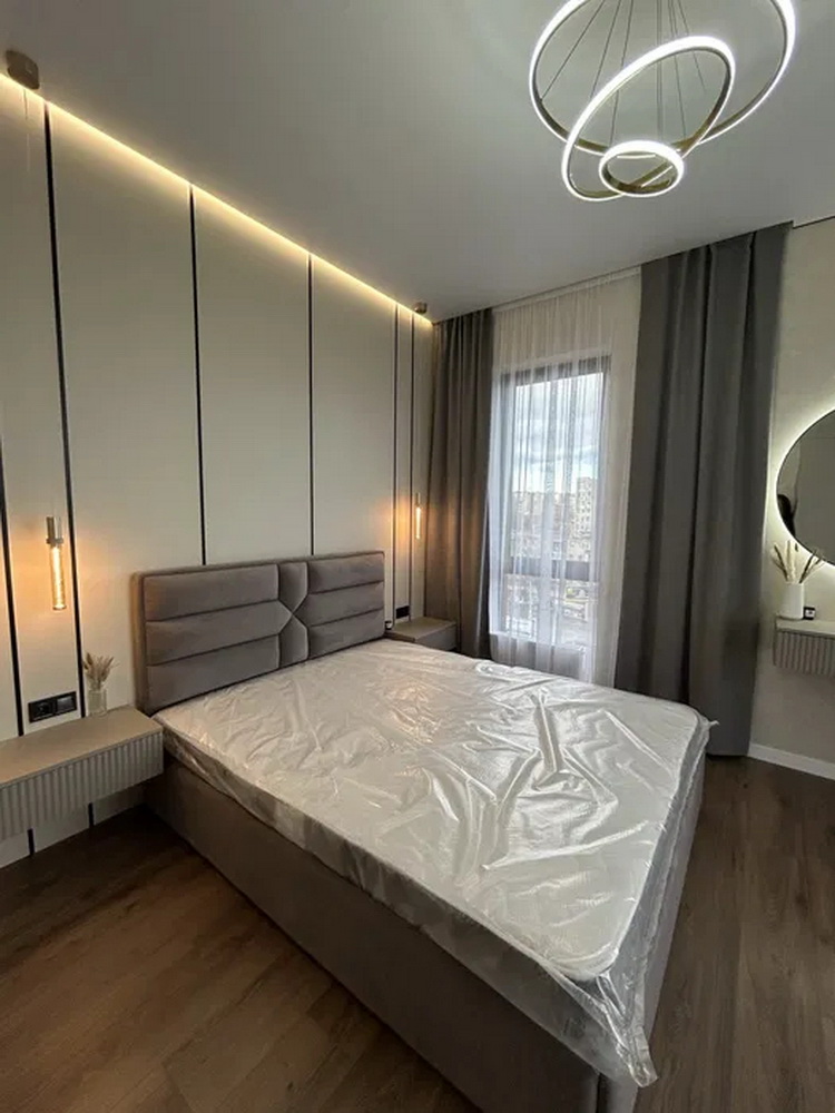 Простір розділений на дві просторові спальні, які подарують вам сонну гармонію та час для відпочинку. Величезна гардеробна кімната забезпечить порядок та зручність зберігання ваших речей. Просторий санвузол спроектований так, щоб стати вашим особистим невеличким оазисом. А кухня-студія з яскравим дизайном та затишною зоною відпочинку стане ідеальним місцем для вечірок із друзями чи романтичних вечорів.