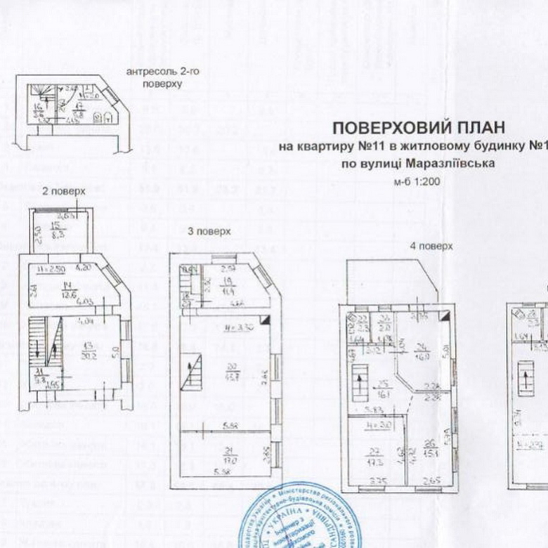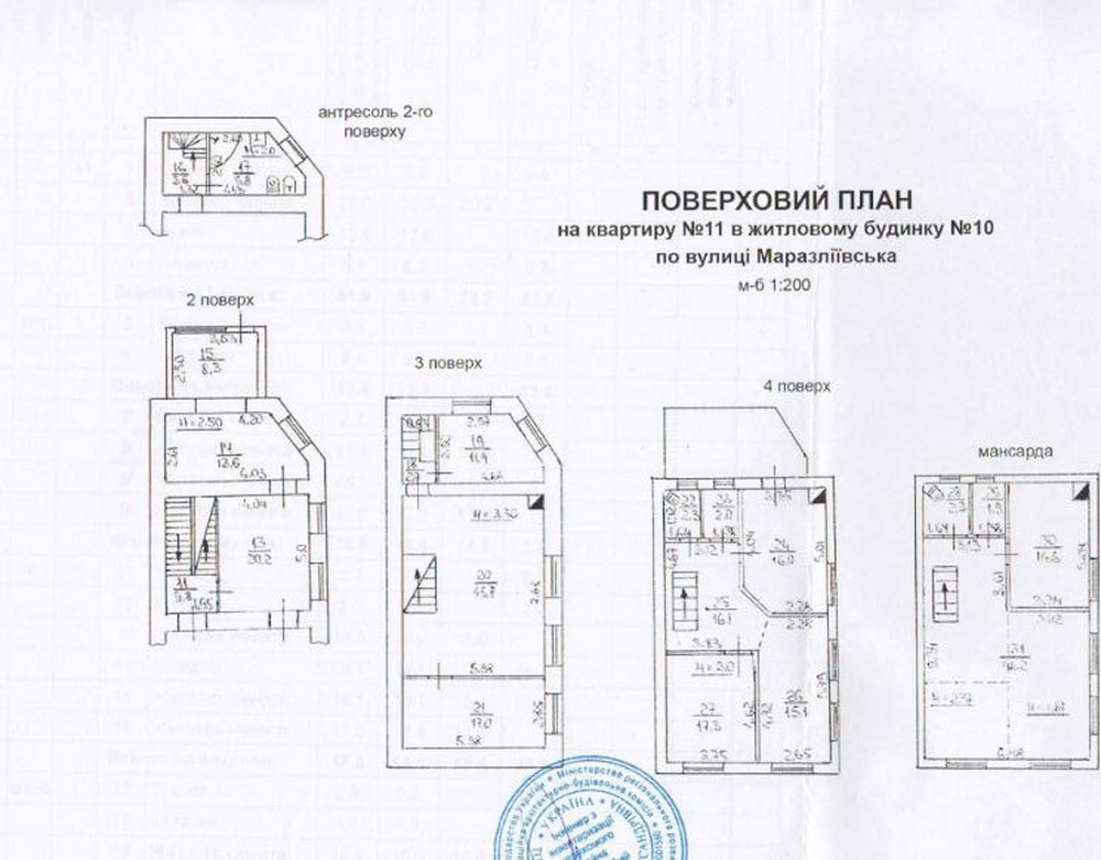 – Різна висота стель: 1-й та 2-й поверхи – 2.6 м, 2.77 м, 4.7 м, 3-й, 4-й, мансарда – 2.5 м, 3.3 м, 2.00 м, що надає вигляд простору та повітряності.