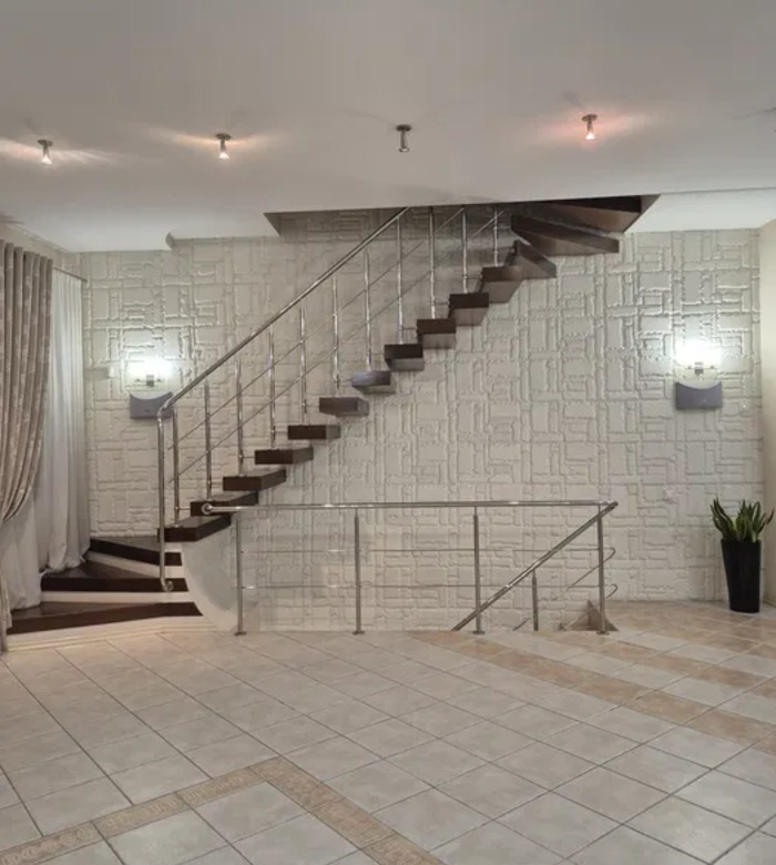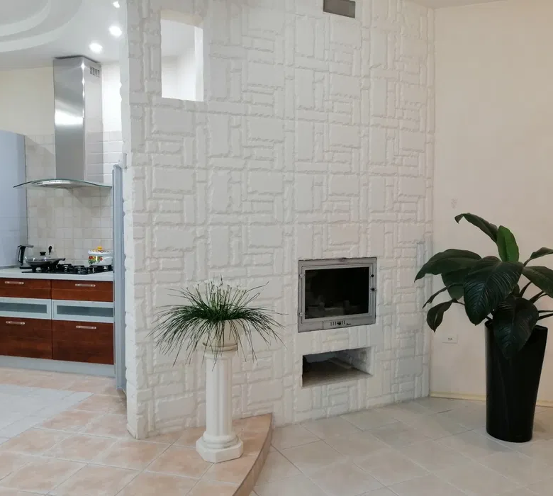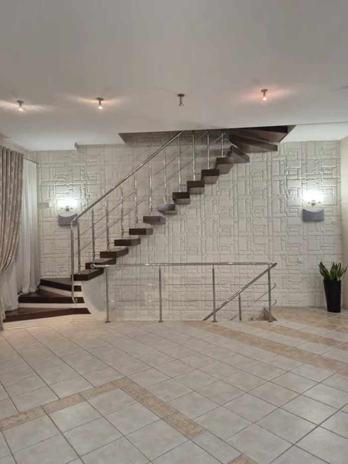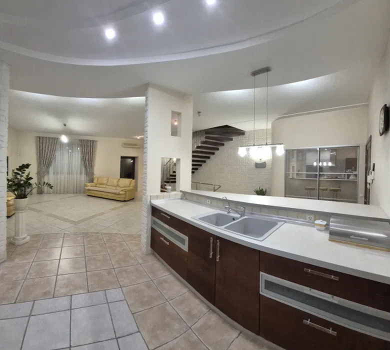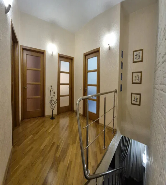Перший поверх – це ідеальне поєднання кухні та затишного залу, а в прихожій вас чекає гардеробна, яка зручно організує ваш простір. Цокольний поверх відкриває перед вами безліч можливостей: гараж, побутова кімната, котельня, баня з дров’яним обігрівом, гостевий санвузол з душем та холл для вашої зручності.